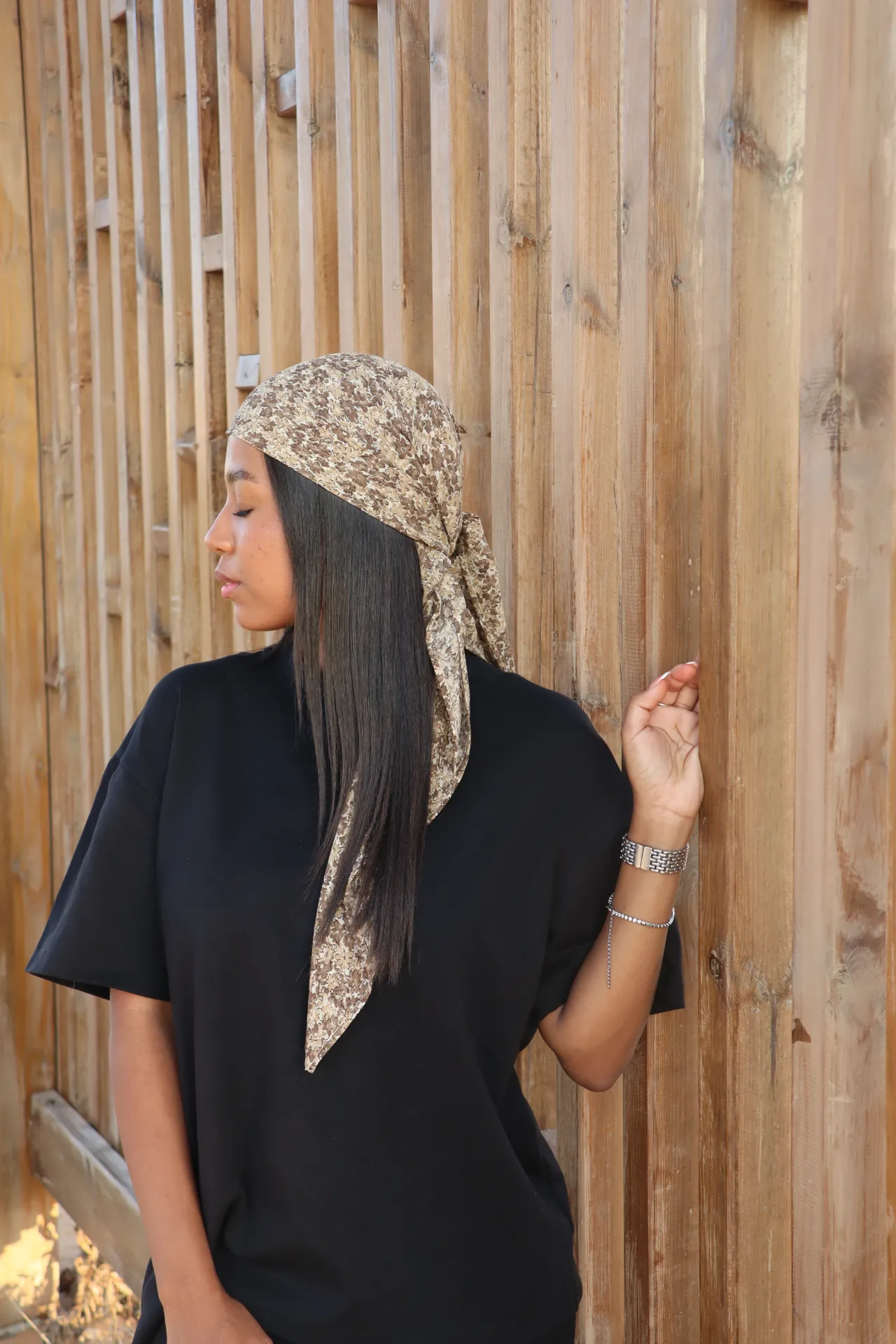 מטפחת רכה בגוון חום עשיר, היוצר מראה שליו וטבעי.