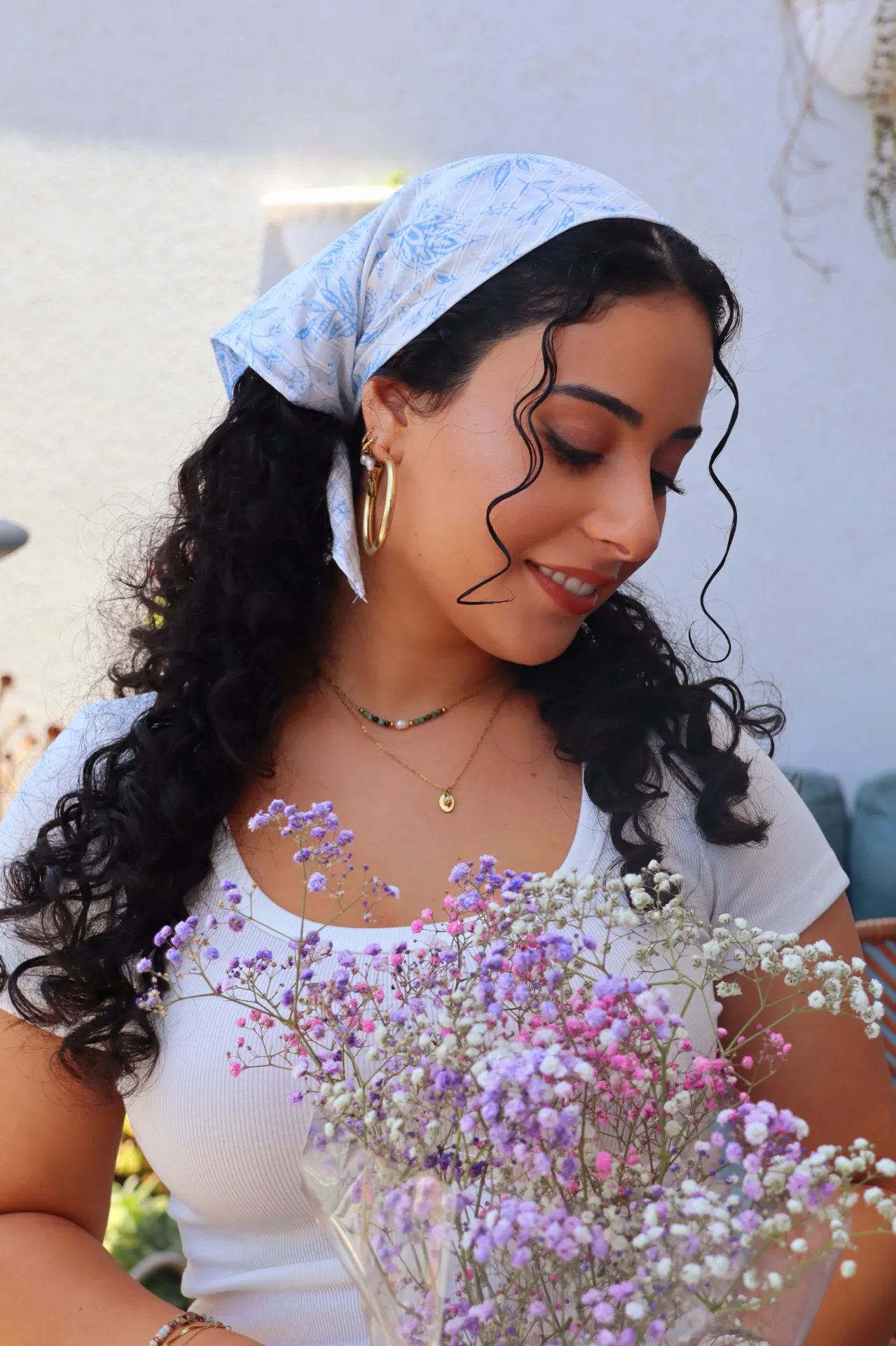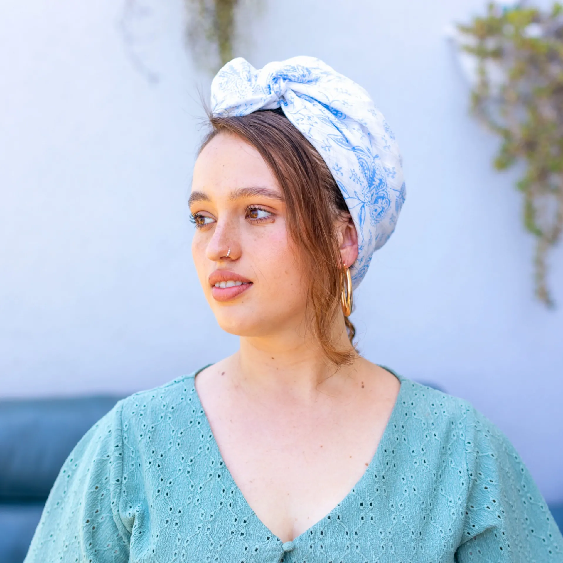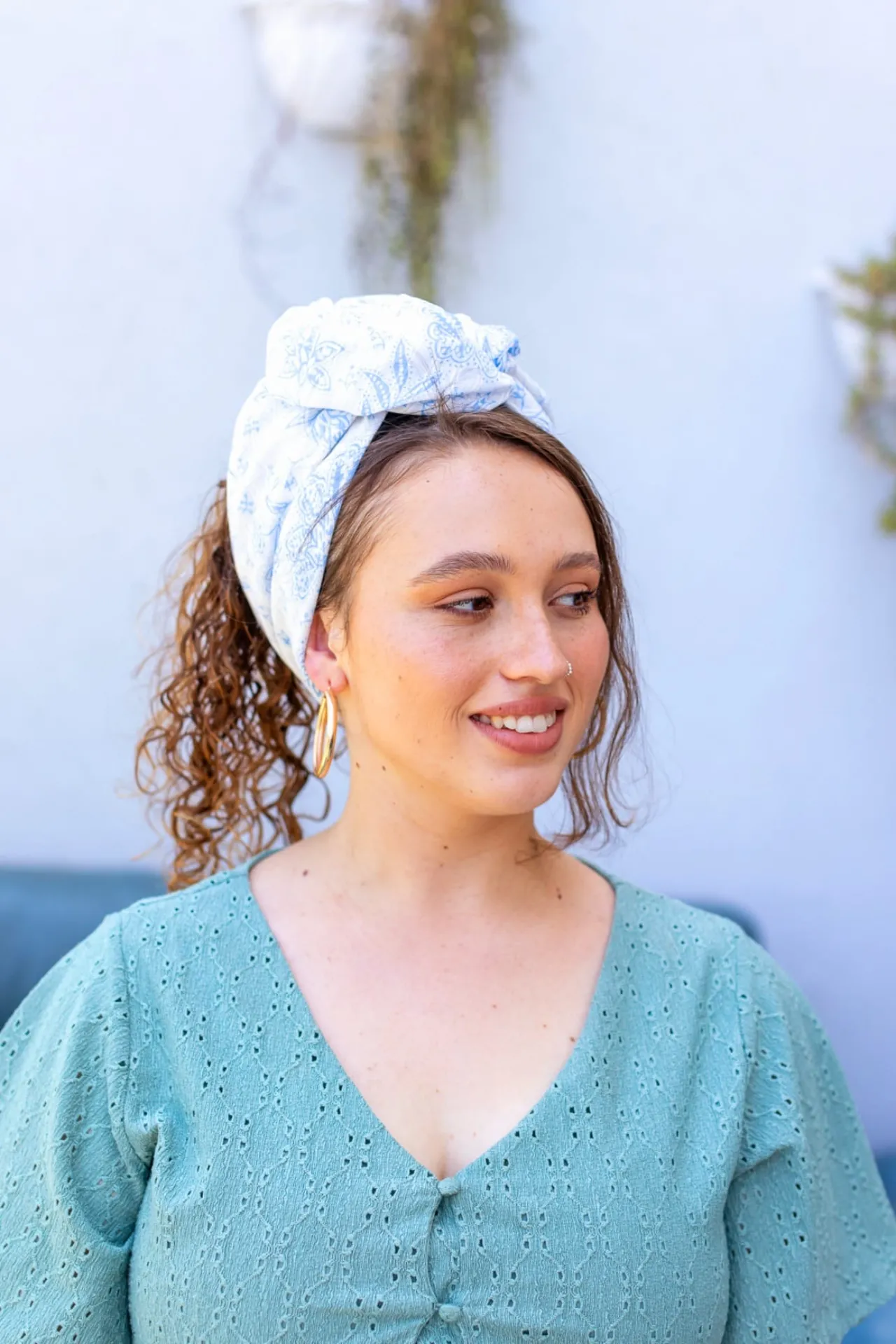 מטפחת/בנדנה קלילה ואוורירית, בעלת מרקם נעים למגע. היא מעוטרת בהדפס פרחוני עדין בגוונים רכים ופסטליים של תכלת ולבן, המעניקים מראה רגוע ונינוח.