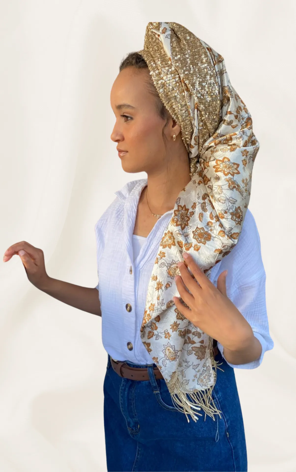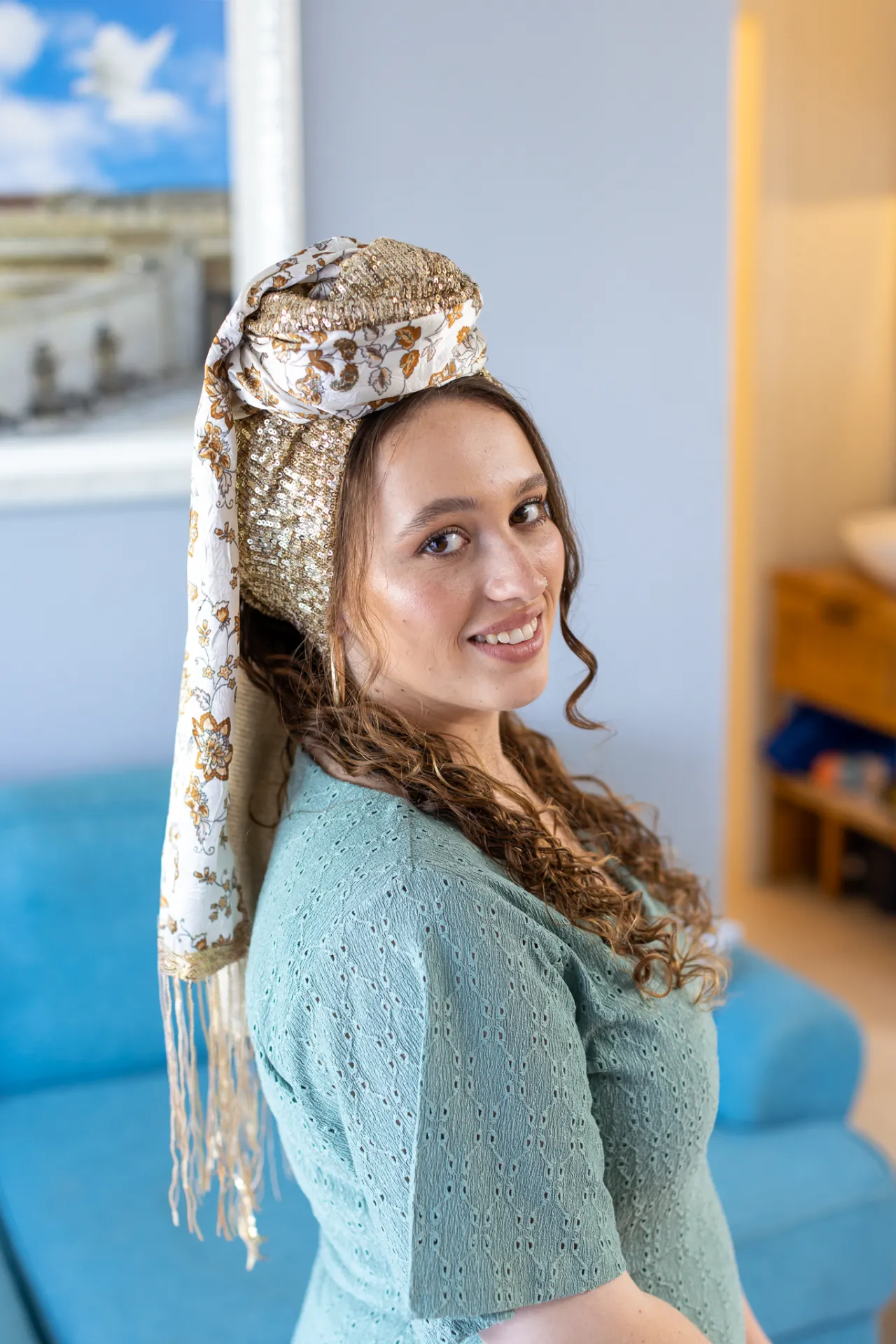 מטפחת ייחודית המעניקה מראה של כתר אמיתי, המשלבת בסיס בד רך עם הדפס עדין של פרחים וענפים, ורצועה רחבה ונוצצת של פייטים זהובים.