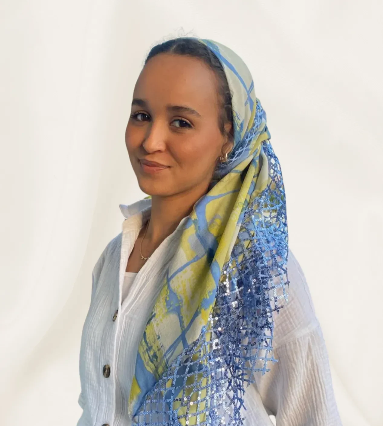 מטפחת ייחודית המורכבת מבד עם הדפס אבסטרקטי המשלב גווני תכלת, שמנת וחרדל עדין, בשילוב רשת כחולה נועזת ומשובצת פייטים מנצנצים.